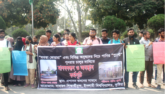 ইসলামী বিশ্ববিদ্যালয়ে (ইবি) সততা ফোয়ারা এবং বিভিন্ন অনুষদের নিচের পানির প্ল্যান্ট পুনরায় চালুর দাবিতে মানববন্ধন ও অবস্থান কর্মসূচি পালন করেছে বিশ্ববিদ্যালয়ের সাধারণ শিক্ষার্থীরা। এ কর্মসূচিতে প্রসাশনকে ২৪ ঘন্টার আল্টিমেটাম দেন শিক্ষার্থীরা।