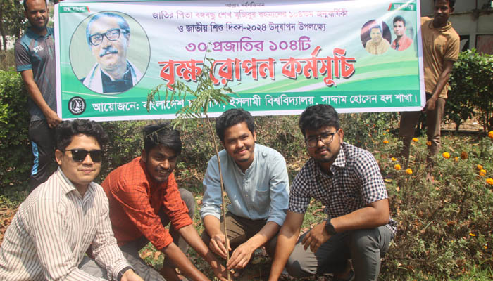 জাতির পিতা বঙ্গবন্ধু শেখ মুজিবুর রহমানের ১০৪তম জন্মবার্ষিকী উপলক্ষ্যে ১০৪ টি গাছের চারা রোপণ করেছে ইসলামী বিশ্ববিদ্যালয়ের (ইবি) সাদ্দাম হোসেন হল শাখা ছাত্রলীগ। রোববার বেলা সাড়ে ১১টায় হল সংলগ্ন এলাকায় এ বৃক্ষরোপন কর্মসূচি পালন করেন তারা।