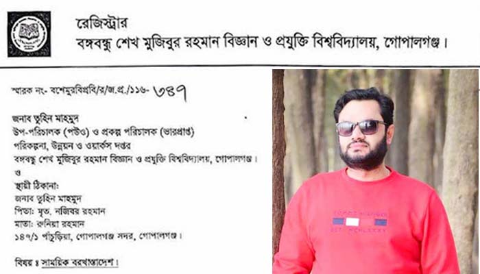 গোপালগঞ্জের বঙ্গবন্ধু শেখ মুজিবুর রহমান বিজ্ঞান ও প্রযুক্তি বিশ্ববিদ্যালয়ের (বশেমুরবিপ্রবি) প্ল্যানিং দপ্তরের পরিচালক (ভারপ্রাপ্ত) তুহিন মাহমুদকে সাময়িক বহিষ্কারসহ সকল দাপ্তরিক কার্যক্রম থেকে বিরত থাকার নির্দেশনা দেয়া হয়েছে।