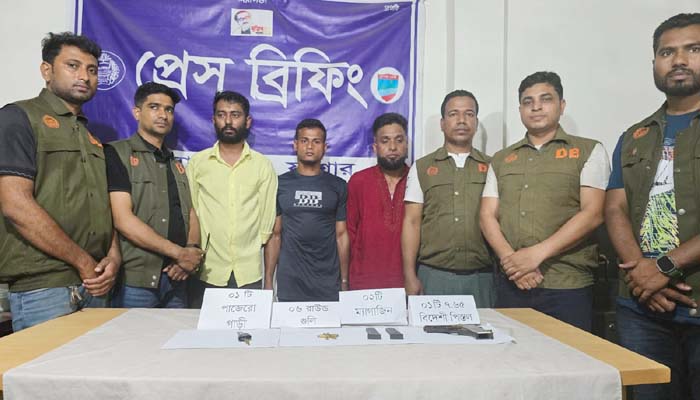 এ সময় সন্দেহজনক ভাবে একটি জিপ গাড়িকে গতিরোধ করা হয়। এরপর জিপ গাড়িতে থাকা তিন আরোহীকে তল্লাশী করলে তাদের নিকট বিদেশী পিস্তল, গুলি ও দুটি ম্যাগাজিন পাওয়া যায়। অস্ত্রসহ তাদের তিনজনকে আটক করা হয়েছে। এ বিষয়ে আইনগত ব্যবস্থা প্রক্রিয়াধীন।