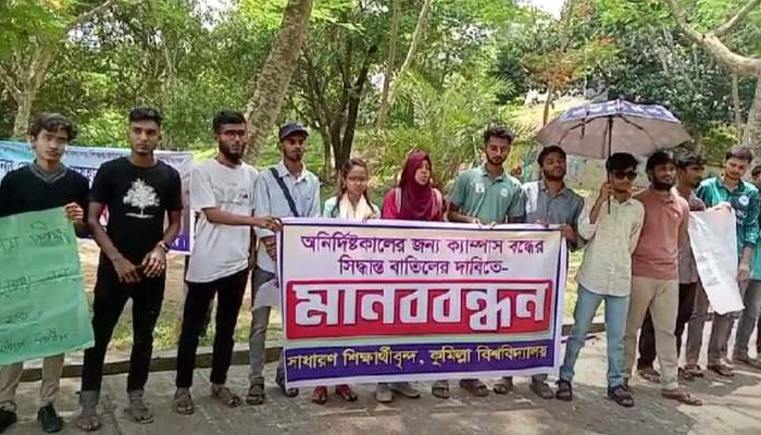 কুমিল্লা বিশ্ববিদ্যালয়ের (কুবি) প্রশাসনের অগণতান্ত্রিক সিদ্ধান্তকে বাতিল করে বিশ্ববিদ্যালয় খোলা এবং ক্লাস-পরিক্ষা চালু করতে মানববন্ধন করেছে সাধারণ শিক্ষার্থীরা।