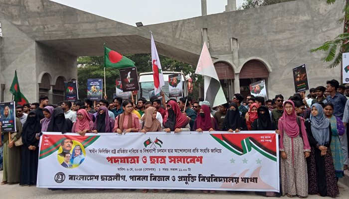 পাবনা বিজ্ঞান ও প্রযুক্তি বিশ্ববিদ্যালয়ে(পাবিপ্রবি) স্বাধীন ফিলিস্তিন রাষ্ট্র প্রতিষ্ঠার দাবিতে ও ইসরায়েলি বর্বরতা ও গণহত্যার বিরুদ্ধে বিশ্বব্যাপী চলমান ছাত্র আন্দোলনের প্রতি সংহতি জানিয়ে পদযাত্রা ও ছাত্র সমাবেশ করেছে পাবিপ্রবি শাখা ছাত্রলীগ ।