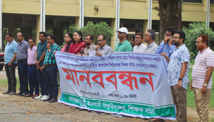 অর্থ মন্ত্রণালয়ের জারিকৃত সার্বজনীন পেনশন সংক্রান্ত নীতিমালার প্রজ্ঞাপন প্রত্যাহারসহ তিন দফা দাবিতে মানববন্ধন করেছে ইসলামী বিশ্ববিদ্যালয় (ইবি) শিক্ষক সমিতি। আগামী ৪ জুনের মধ্যে সুরাহা না হলে বৃহত্তর কর্মসূচির ঘোষণা দেন তারা। রবিবার বেলা সাড়ে ১১ টার দিকে অনুষদ ভবনের সামনে এই কর্মসূচি হয়।
