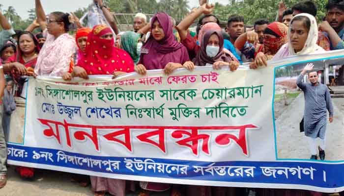 নড়াইল সদর উপজেলার সিংগাশোলপুর ইউনিয়ন পরিষদের সাবেক চেয়ারম্যান উজ্জ্বল শেখের মুক্তির দাবিতে মানববন্ধন ও বিক্ষোভ সমাবেশ অনুষ্ঠিত হয়েছে।রোববার (৯জুন) সকাল সাড়ে ১০টায় গোবরা বাজার এলাকায় ঘন্টাব্যাপি চলা মানবন্ধন ও বিক্ষোভ সমাবেশে এলাকার নারী-পুরুষ ও ব্যবসায়ীরা অংশগ্রহণ করেন। মানববন্ধন চলাকালে বক্তব্য দেন গোবরা বাজারের ব্যবসায়ী মোহাম্মদ নুরুজ্জামান, হাফেজ মাওলানা আরেফ বিল্লাহ, মোসাঃ নাজমা খাতুন প্রমূখ।