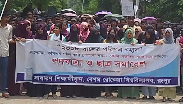 সরকারি চাকরিতে কোটা ব্যবস্থা বাতিল করে ২০১৮ সালে সরকারের জারি করা পরিপত্র পুনর্বহালসহ চার দফা দাবি আদায়ে পূর্বঘোষিত ‘বাংলা ব্লকেড’ কর্মসূচির অংশ হিসেবে ঢাকা-রংপুর মহাসড়ক অবরোধ করে বিক্ষোভ করেন বেগম রোকেয়া বিশ্ববিদ্যালয়ের (বেরোবি) শিক্ষার্থীরা। এতে করে রাস্তার দু’পাশে দীর্ঘ যানজটের সৃষ্টি হয়।