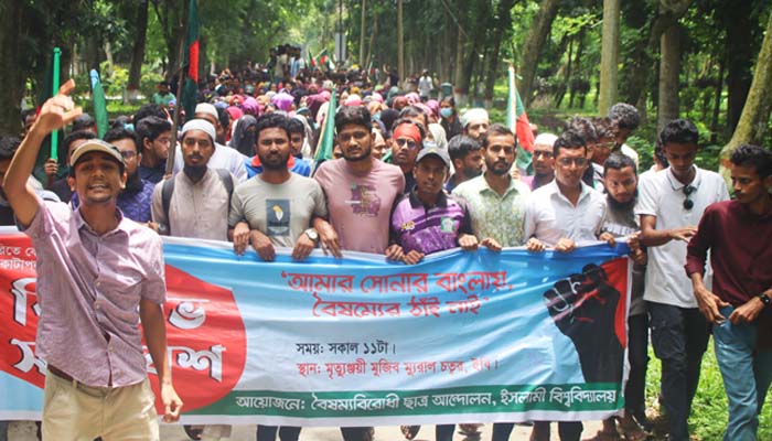 ক্যাম্পাসের বটতলা থেকে বিক্ষোভ মিছিল বের হয়ে উপাচার্যের বাসভবন, আবাসিক হলসমূহ ও ক্যাম্পাসের বিভিন্ন গুরুত্বপূর্ণ সড়ক প্রদক্ষিণ শেষে ‘মৃত্যুঞ্জয়ী মুজিব’ ম্যুরালের পাদদেশে সমাবেশে মিলিত হয়। এতে সহস্রাধিক শিক্ষার্থী অংশ নেয়। শিক্ষার্থীদের দাবিগুলো হলো- কোটা নিয়ে প্রধানমন্ত্রী শেখ হাসিনার বক্তব্য প্রত্যাহার, সোমবার সারাদেশে আন্দোলনকারীদের উপর হামলার প্রতিবাদ ও কোটা সংস্কারের এক দফা দাবি।