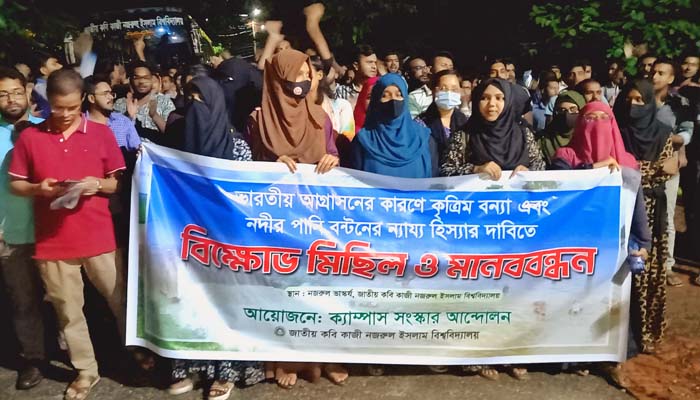 ভারতের সঙ্গে বাংলাদেশের আন্তঃসীমান্ত নদীর পানির ন্যায্য হিস্যার দাবিতে এবং উদ্দেশ্যপ্রণোদিতভাবে বিভিন্ন নদীর বাঁধ খুলে আকস্মিক বন্যা সৃষ্টির প্রতিবাদে বিক্ষোভ মিছিল করেছে জাতীয় কবি কাজী নজরুল ইসলাম বিশ্ববিদ্যালয়ের শিক্ষার্থীরা।