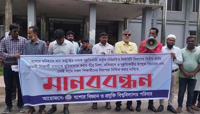 মানববন্ধনে যবিপ্রবির শিক্ষক ড. আমজাদ হোসেন বলেন, আমরা এই ঘটনার তীব্র নিন্দা জানাই। শিক্ষার্থীদের নিরাপত্তা নিশ্চিত করার জন্য আমরা সব সময় তাদের পাশে থাকব। ভবিষ্যতে বিশ্ববিদ্যালয়ের নিরাপত্তা রক্ষার্থে সবাইকে একতাবদ্ধ হতে হবে। বিশ্ববিদ্যালয়ের তথ্য কর্মকর্তা মোহাম্মদ নাজমুল হোসাইন বলেন, শিক্ষার্থীকে ছুরিকাঘাতের ঘটনাকে আমরা তীব্রভাবে নিন্দা জানাচ্ছি। ভবিষ্যতে এমন কোনো ঘটনা ঘটলে আমরা রাস্তা অবরোধ করে আন্দোলনে নামব।