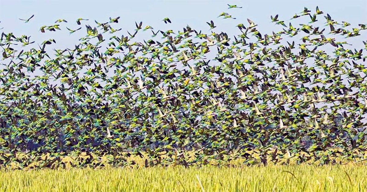 মাঠজুড়ে সোনালী আমন ধান। কৃষকরা এখন ধান কাটতে ব্যস্ত। এসময়ে এসেছে টিয়া পাখির দল। রাঙ্গুনিয়ার গুমাই বিল মুখরিত হয়ে উঠেছে পাখির আগমনে। নবান্ন উৎসবে তারাও আমন্ত্রিত অতিথি। শীতের মাসে দূর দেশ থেকে খাদ্যের আশায় উড়ে আসে অসংখ্য পরিযায়ী পাখি। যেসব দেশে শীতের তীব্রতা বেশি, সেখানে এসময়ে পাখিগুলোর টিকে থাকা কঠিন হয়ে পড়ে; খাবার থাকে না। বাসা বাঁধার জায়গা থাকে না। কোনো কোনো পাখি হাজার হাজার মাইল পথ পাড়ি দেয়। গুমাই বিলে পাকা ধান খেতে নেমেছে পাখির ঝাঁক।