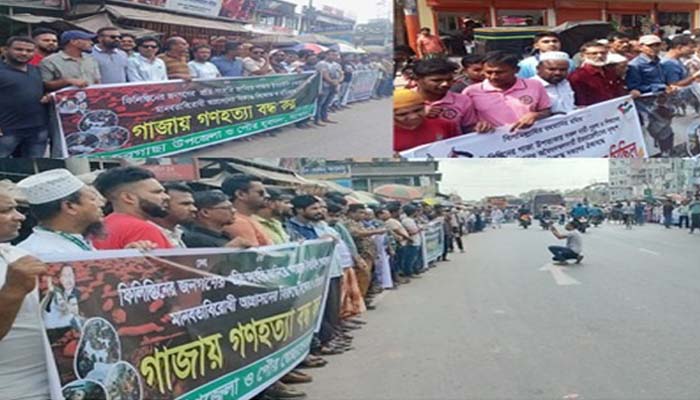 ফিলিস্তিনের গাজায় ইসরায়েলি দখলদার বাহিনী কর্তৃক বর্বরোচিত গণহত্যার প্রতিবাদে ও স্বাধীন ফিলিস্তিন রাষ্ট্রের দাবিতে ঝিকরগাছা প্রেসক্লাবের আয়োজনে মানববন্ধন ও সমাবেশ অনুষ্ঠিত হয়েছে। বুধবার (০৯ এপ্রিল) জোহরবাদ স্থানীয় বাসস্ট্যান্ড যশোর – বেনাপোল মহাসড়ক দু’ধারে দীর্ঘ মানববন্ধন ও সমাবেশে সভাপতিত্ব করেন, ঝিকরগাছা প্রেসক্লাবের সভাপতি মোঃ রফিকুল ইসলাম। প্রায় ঘন্টাব্যাপী চলা এই মানববন্ধন ও প্রতিবাদ সমাবেশে এসময় বক্তব্য রাখেন,