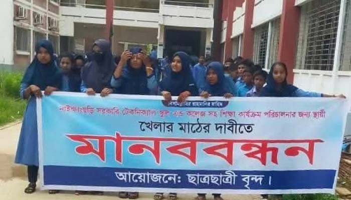 খেলার মাঠের দাবিতে নাইক্ষ্যংছড়ি টেকনিক্যাল স্কুল এন্ড কলেজের শিক্ষার্থীরা মানববন্ধনে মাদক চাই না, খেলতে চাই, খেলার মাঠ চাওয়ার আমাদের অধিকার’ এই স্লোগানকে সামনে রেখে মানববন্ধন ও স্মারকলিপি প্রদান করেছেন শিক্ষার্থীরা।