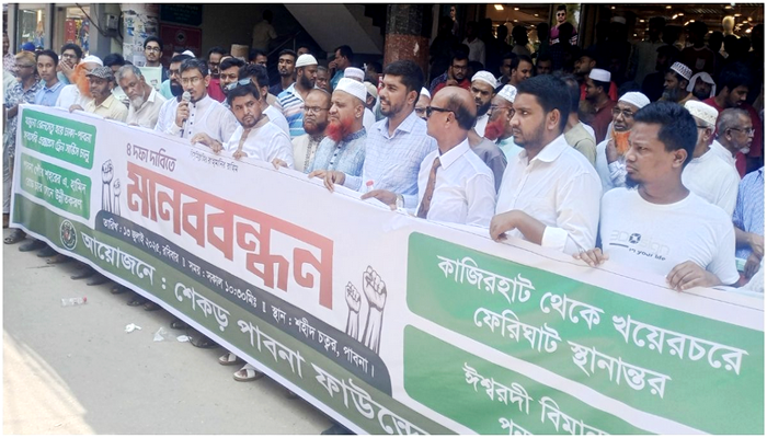 পাবনা থেকে ঢাকায় সরাসরি ট্রেন সার্ভিস চালু, ঈশ্বরদী বিমানবন্দর চালু, শহরে চার লেন সড়ক নির্মাণ, আরিচা-কাজিরহাট ফেরিঘাট খয়েরচরে স্থানান্তরের দাবিতে মানববন্ধন করেছে শেকড় পাবনা ফাউন্ডেশনের ব্যানারে পাবনাবাসী। যেকোন মূল্যে ট্রেন সার্ভিস চালু করতে হরে এই সরকারকে। এসব চারদফা দাবি বাস্তবায়ন না হলে চরম মূল্য দিতে হবে সংশ্লিষ্টদের বলে হুঁশিয়ারী দেওয়া হয়।