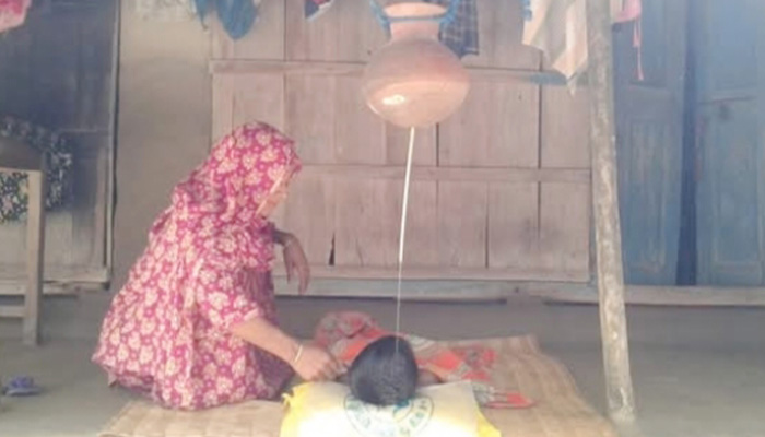 বিছানায় চিৎ হয়ে উঠানের দিকে মাথা দিয়ে শুয়ে আছে মেহজাবিন,তার মা মাথার উপর মাটির টিলা ঝুলিয়ে তার তলে ছিদ্র করে পাটখড়ি দিয়ে পানি দিচ্ছে মেহজাবিনের মাথায় ও কপালে, গত চারদিন যাবৎ সে জ্বরে আক্রান্ত।ঔষধ খেলেও কখনো একটু জ্বর কমছে আবার বাড়ছে।
