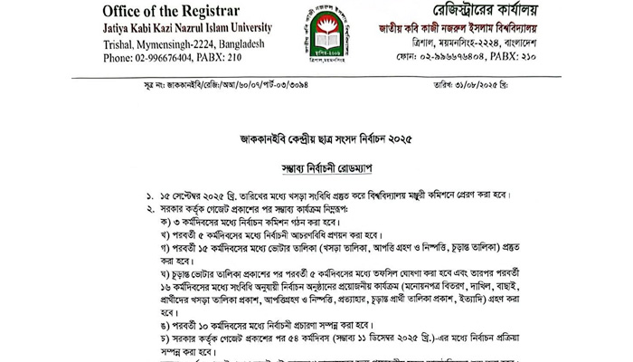 ত্রিশালের জাতীয় কবি কাজী নজরুল ইসলাম বিশ্ববিদ্যালয়ে ছাত্র সংসদ নির্বাচনের সম্ভাব্য রোডম্যাপ ঘোষণা করেছে বিশ্ববিদ্যালয় প্রশাসন। এর আগে শিক্ষার্থীরা পূর্ণাঙ্গ রোডম্যাপের দাবিতে আমরণ অনশনের ডাক দেন।