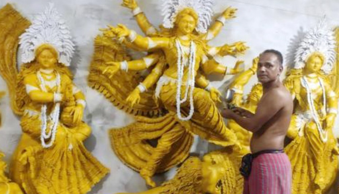 খুলনার পাইকগাছা উপজেলার কপিলমুনিতে এবার শারদীয় দুর্গোৎসবে ব্যতিক্রমী আয়োজন করে সবার দৃষ্টি কেড়েছে একটি মন্দির। কপিলমুনি পূর্বপাড়া হরিসভা পূজা মন্দির কমিটির উদ্যোগে তৈরি করা হয়েছে সোনালি রঙের প্রতিমা। নোয়াকাটি গ্রামের ভাস্কর নিমাই বিশ্বাসের সুনিপুণ শিল্পকর্মে দুর্গা, লক্ষ্মী, সরস্বতী, গণেশ, কার্তিকসহ প্রতিমাগুলো সাজানো হয়েছে বর্ণাঢ্য সাজে।