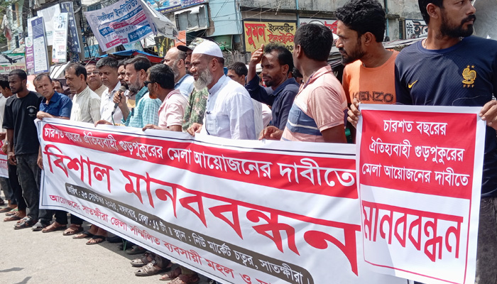 সাতক্ষীরার চারশত বছরের ঐতিহ্য বহনকারী ঐতিহ্যবাহী গুড়পুকুরের মেলা আয়োজনের দাবীতে সাতক্ষীরায় বিশাল মানববন্ধন অনুষ্ঠিত হয়েছে। মঙ্গলবার (২৩ সেপ্টেম্বর) সকাল ১১ টায় শহরের নিউমার্কেটের সামনে সাতক্ষীরা জেলা সম্মিলিত ব্যবসায়ী মহল ও সাতক্ষীরাবাসীর আয়োজনে প্রাক্তন মন্ত্রী ডা. আফতাবুজ্জামান এর সভাপতিত্বে মানববন্ধনে বক্তব্য রাখেন সাবেক জেলা শিক্ষা অফিসার কিশোরী মোহন সরকার, দৈনিক প্রথম আলো পত্রিকার নিজস্ব প্রতিবেদক কল্যাণ ব্যানার্জি, সাতক্ষীরা কেন্দ্রীয় পাবলিক লাইব্রেরির সাধারণ সম্পাদক মোঃ কামরুজ্জামান রাসেল, জেলা নাগরিক কমিটির যুগ্ম আহ্বায়ক আলি নুর খান বাবুল, উদীচী সাতক্ষীরা জেলা শাখার সভাপতি শেখ সিদ্দিকুর রহমান, সাতক্ষীরা জেলা ডেকোরেটর মালিক সমিতির কামরুজ্জামান কামু, সহ-সভাপতি গোলাম কুদ্দুস, হোটেল রেস্তোরাঁ ও বস্ত্র ব্যবসায়ী সমিতির জিল্লুর রহমান, বস্ত্র ব্যবসায়ী সমিতির মাসুম বিল্লাহ মিল্টন প্রমুখ। এছাড়াও ঐতিহ্যবাহী গুড় পুকুরের মেলা বসানোর দাবীতে মানববন্ধনে সংহতি প্রকাশ করেছেন সাতক্ষীরা জেলা বিএনপির সাবেক সাধারণ সম্পাদক শেখ কামরুল ইসলাম ফারুক, সাতক্ষীরা জেলা সাংবাদিক সোসাইটির সভাপতি তৌফিকুজ্জামান লিটু, নারী উদ্যোক্তা তামান্না তাসনিম, কণ্ঠশিল্পী আবু আফফান রোজবাবু, স্বদেশ এনজিও নির্বাহী পরিচালক মাধব দত্ত, হিন্দু বৌদ্ধ খ্রিস্টান ঐক্য পরিষদের সাধারণ সম্পাদক স্বপন কুমার শীল, জেলা নাগরিক কমিটির আহবায়ক এড. শেখ আজাদ হোসেন বেলাল, ভাজা ও ফুচকা ব্যবসায়ী সমিতির সভাপতি বিল্লাল হোসেন ও মুনসুর রহমান প্রমুখ।